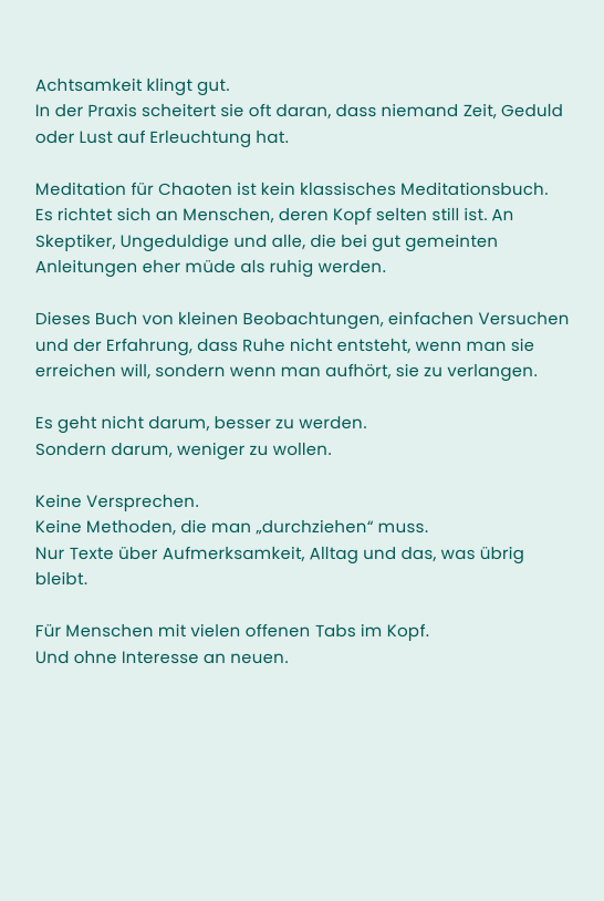 „Meditation für Chaoten" ist kein klassischer Meditationsratgeber. Es erklärt nichts schön und verspricht nichts Endgültiges.